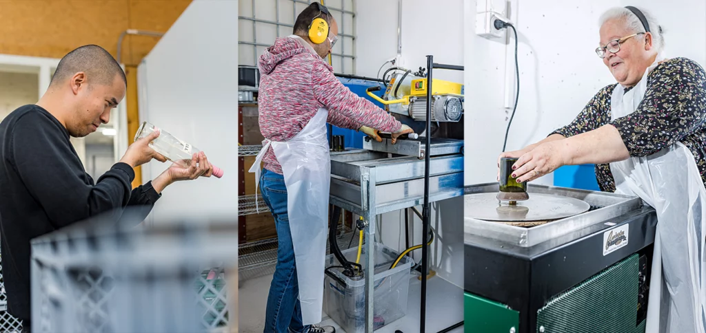 Chaque bouteille est soigneusement collectée, découpée et transformée par petites séries. Derrière l’apparente simplicité, un processus long et rigoureux mêle savoir-faire manuel et outillage spécialisé, sans automatisation.